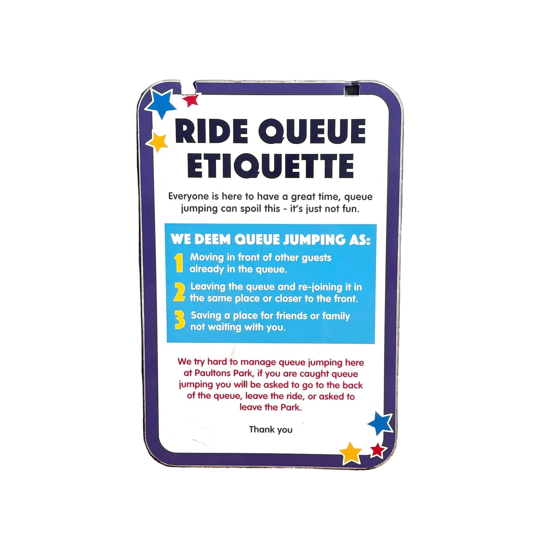 Own a piece of Paultons Park history with this authentic Ride Queue Etiquette Swingboard Sign. A genuine collectible from the beloved theme park, this sturdy display features the park's official messaging on queue behaviour and fairness. Perfect for enthusiasts, former visitors, or anyone wanting to bring a touch of park nostalgia home.